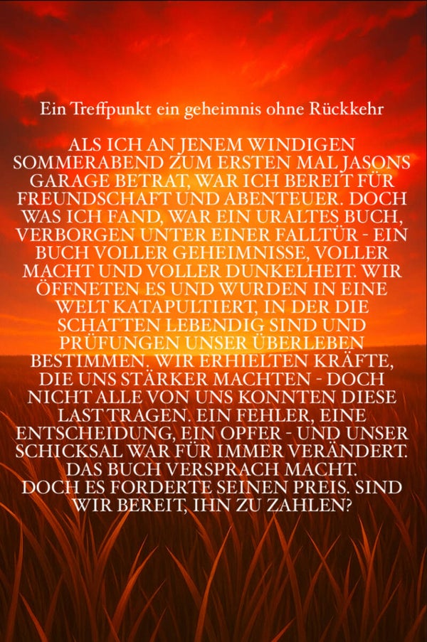 ALS ICH AN JENEM WINDIGEN SOMMERABEND ZUM ERSTEN MAL JASONS GARAGE BETRAT, WAR ICH BEREIT FÜR FREUNDSCHAFT UND ABENTEUER. DOCH WAS ICH FAND, WAR EIN URALTES BUCH, VERBORGEN UNTER EINER FALLTÜR - EIN BUCH VOLLER GEHEIMNISSE, VOLLER MACHT UND VOLLER DUNKELHEIT. WIR ÖFFNETEN ES UND WURDEN IN EINE WELT KATAPULTIERT, IN DER DIE SCHATTEN LEBENDIG SIND UND PRÜFUNGEN UNSER ÜBERLEBEN BESTIMMEN. WIR ERHIELTEN KRÄFTE, DIE UNS STÄRKER MACHTEN - DOCH NICHT ALLE VON UNS KONNTEN DIESE LAST TRAGEN. EIN FEHLER, EINE ENTSCHEIDUNG, EIN OPFER - UND UNSER SCHICKSAL WAR FÜR IMMER VERÄNDERT. DAS BUCH VERSPRACH MACHT. DOCH ES FORDERTE SEINEN PREIS. SIND WIR BEREIT, IHN ZU ZAHLEN?